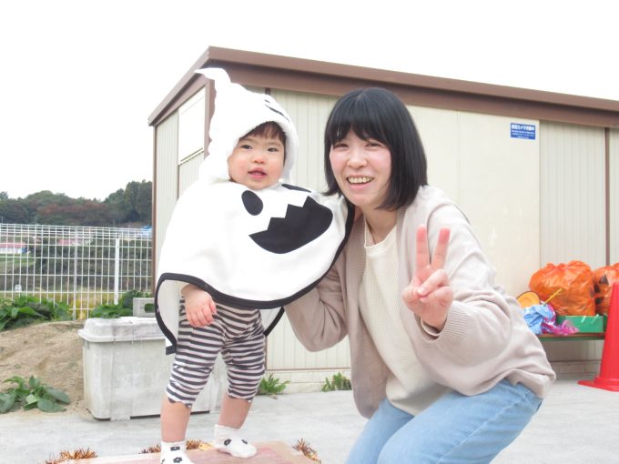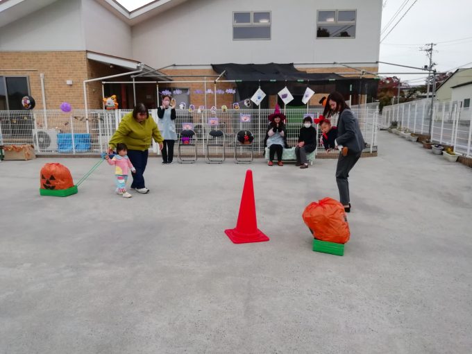 今日のメインは『親子でランウェイ』恥ずかしかったり、堂々と歩いたり。ハイハイ・よちよち歩きのほし組さんに癒されたり(*´▽`*)お母さんも仮装して下さってありがとうございます~☆お次は『かぼちゃのおばけを乗せたリレー』どの子も喜んで引っ張っていましたね~練習の成果ばっちりです(笑)