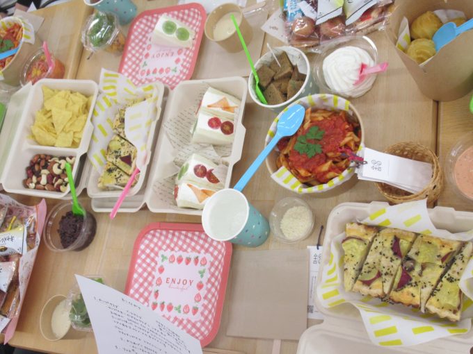GREEN for TABLEさん(たんぽぽ保育園のママ姉妹さん)の美味しいトマトを使ったペンネやフルーツサンド(私は柿&トマト^^)、旬なお野菜を使った秋色キッシュ、焼き芋のスープなど、どれも美味しくて~乾杯のあとは、皆さん黙々と美味しさを堪能しましたよ(笑)