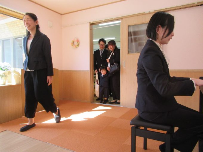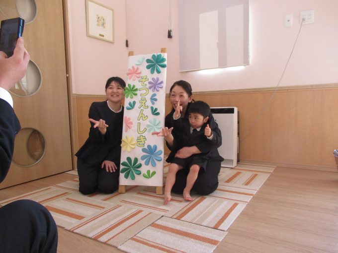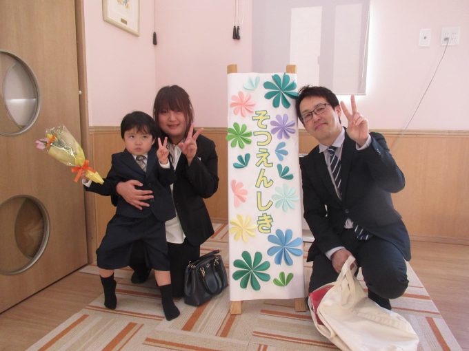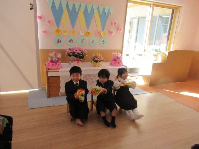 お部屋では、担任のあいさつと保護者さんから溢れる思いを話していただいた後に、子どもたちの3年間を映像で振り返りました!赤ちゃんだった頃、お友だちや先生とのたくさんの思い出、ご両親からお子さんへのメッセージを入れた映像に、自分が映ると嬉しそうに話しかけてましたね…保護者さんと先生たちは感動でウルウルでした(^^)保護者の皆様、長い間、たんぽぽ保育園に通っていただいて本当にありがとうございます✨